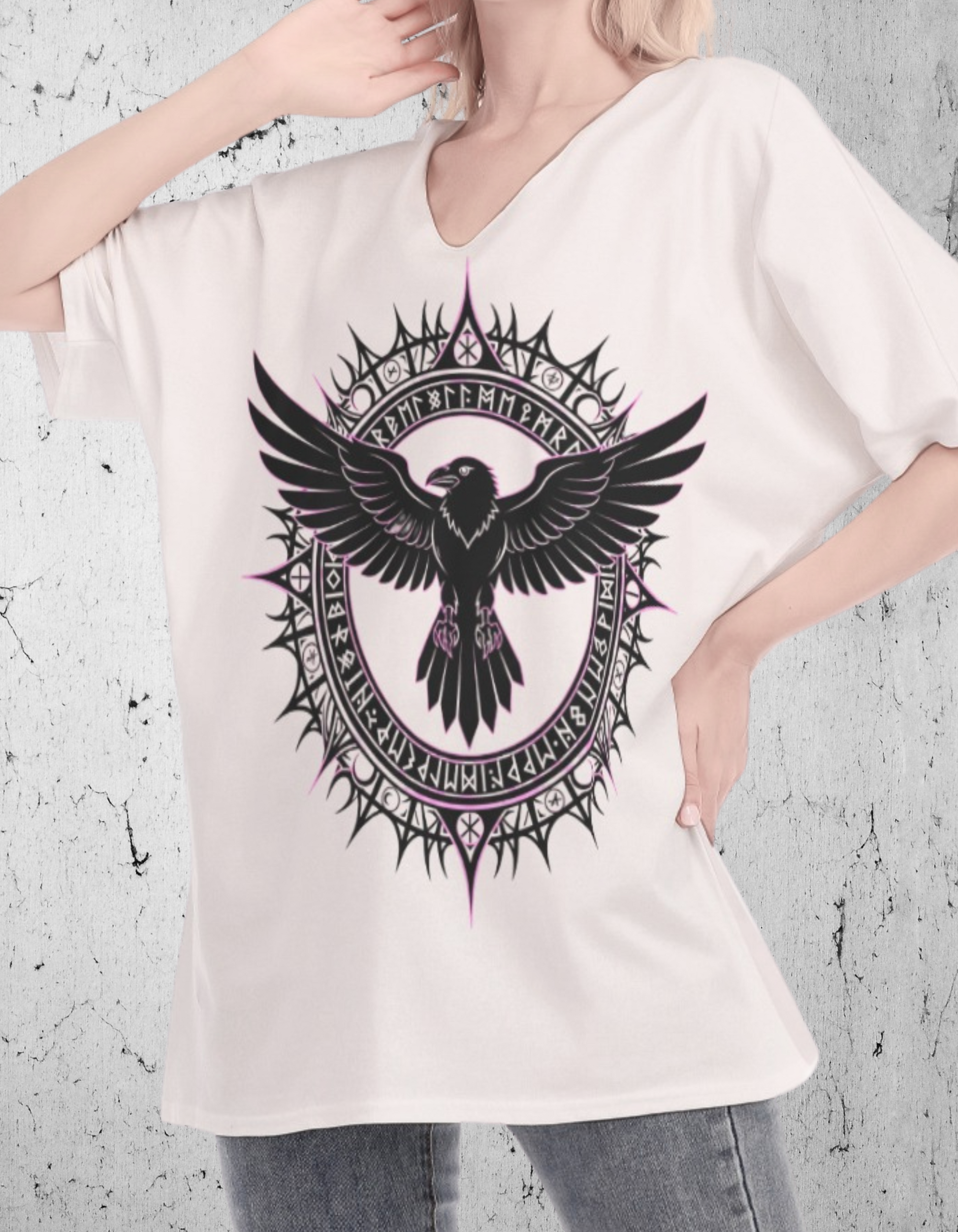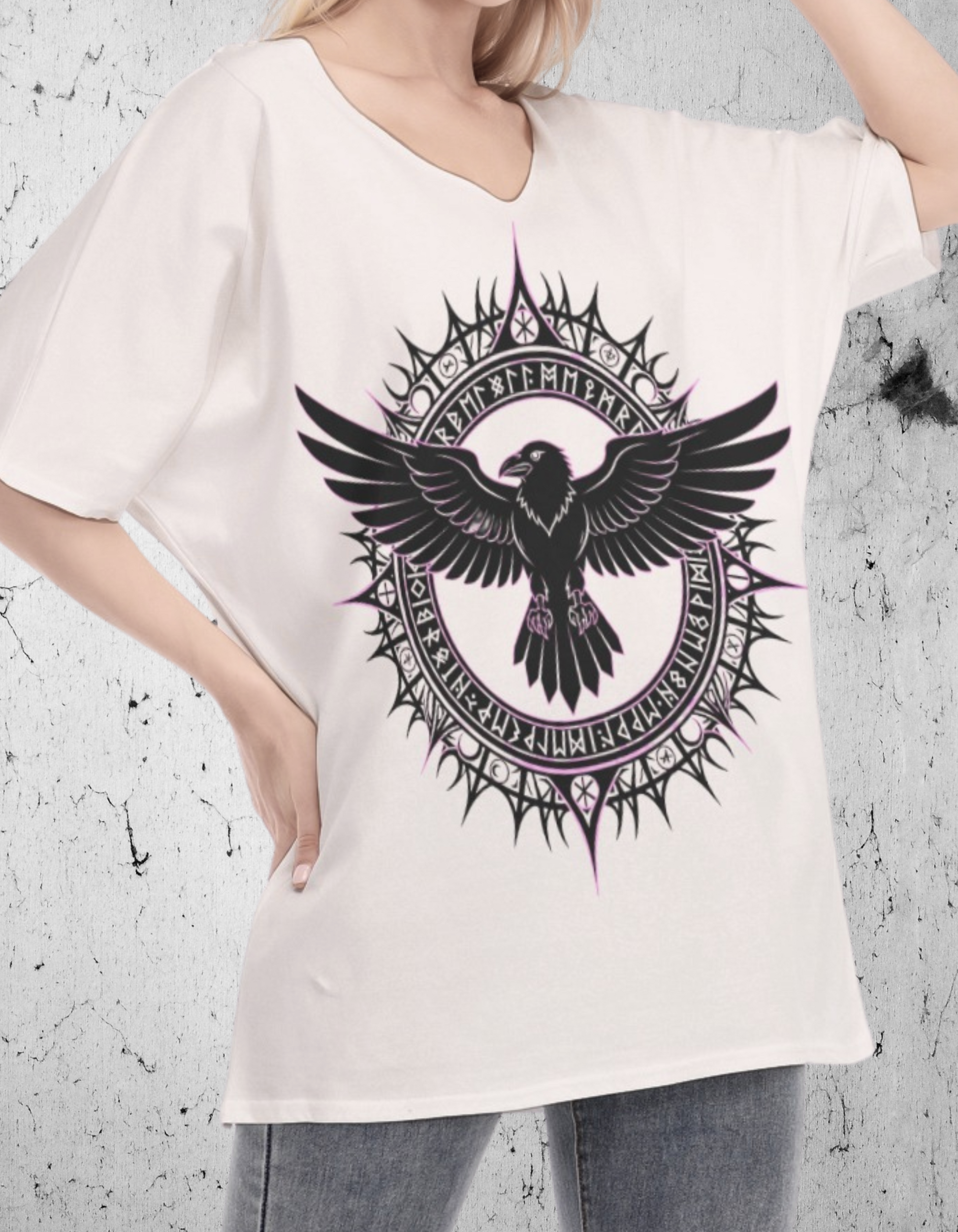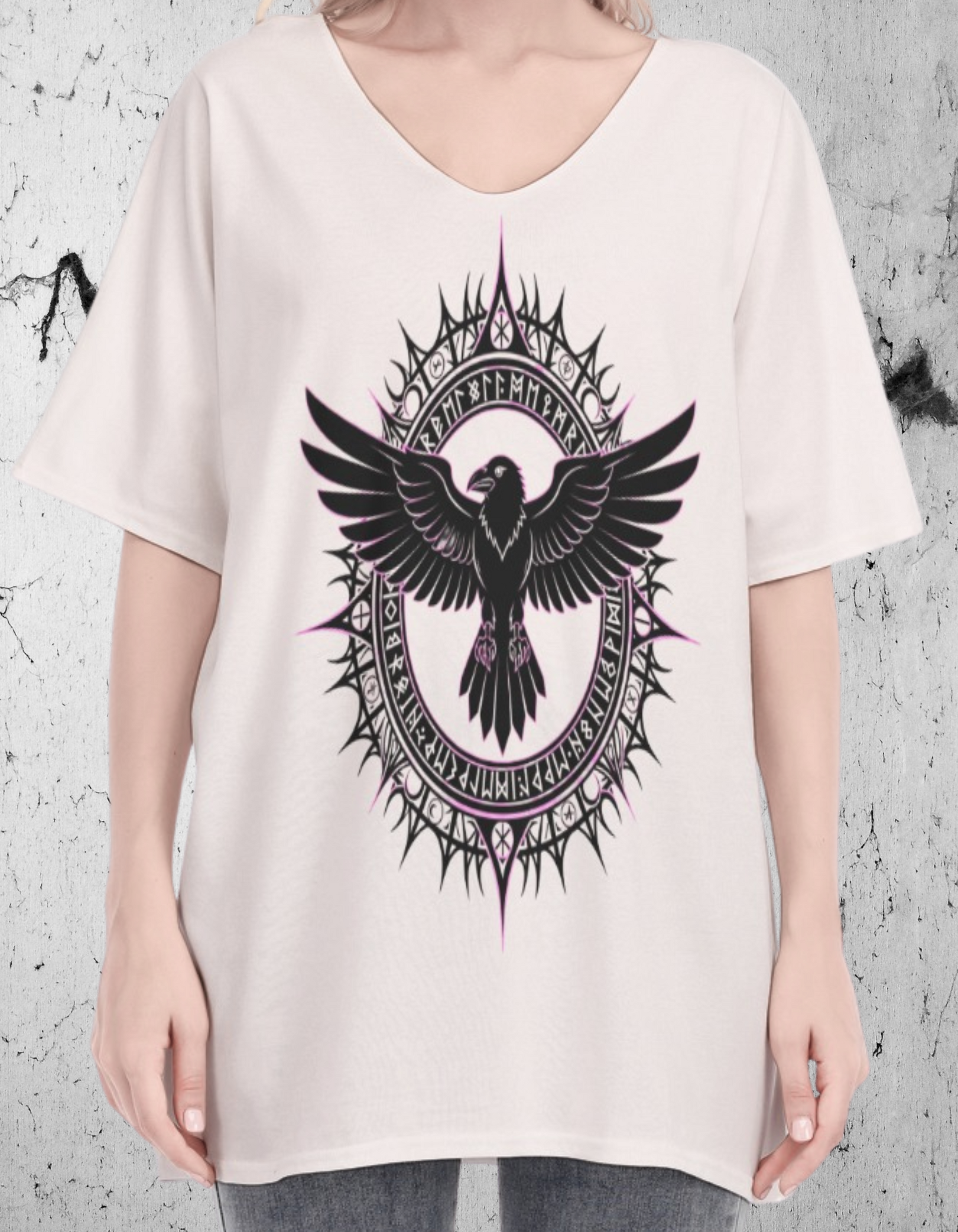 Motyw kruka w kulturze gotyckiej i nordyckiej od wieków był symbolem mądrości, magii i posłańca między światami. Okrąg runiczny, który oplata ptaka, podkreśla mistyczny charakter koszulki i nadaje jej aurę tajemnicy. To nie tylko ubranie – to gotycki amulet, który łączy w sobie elementy sztuki, historii i alternatywnej estetyki.