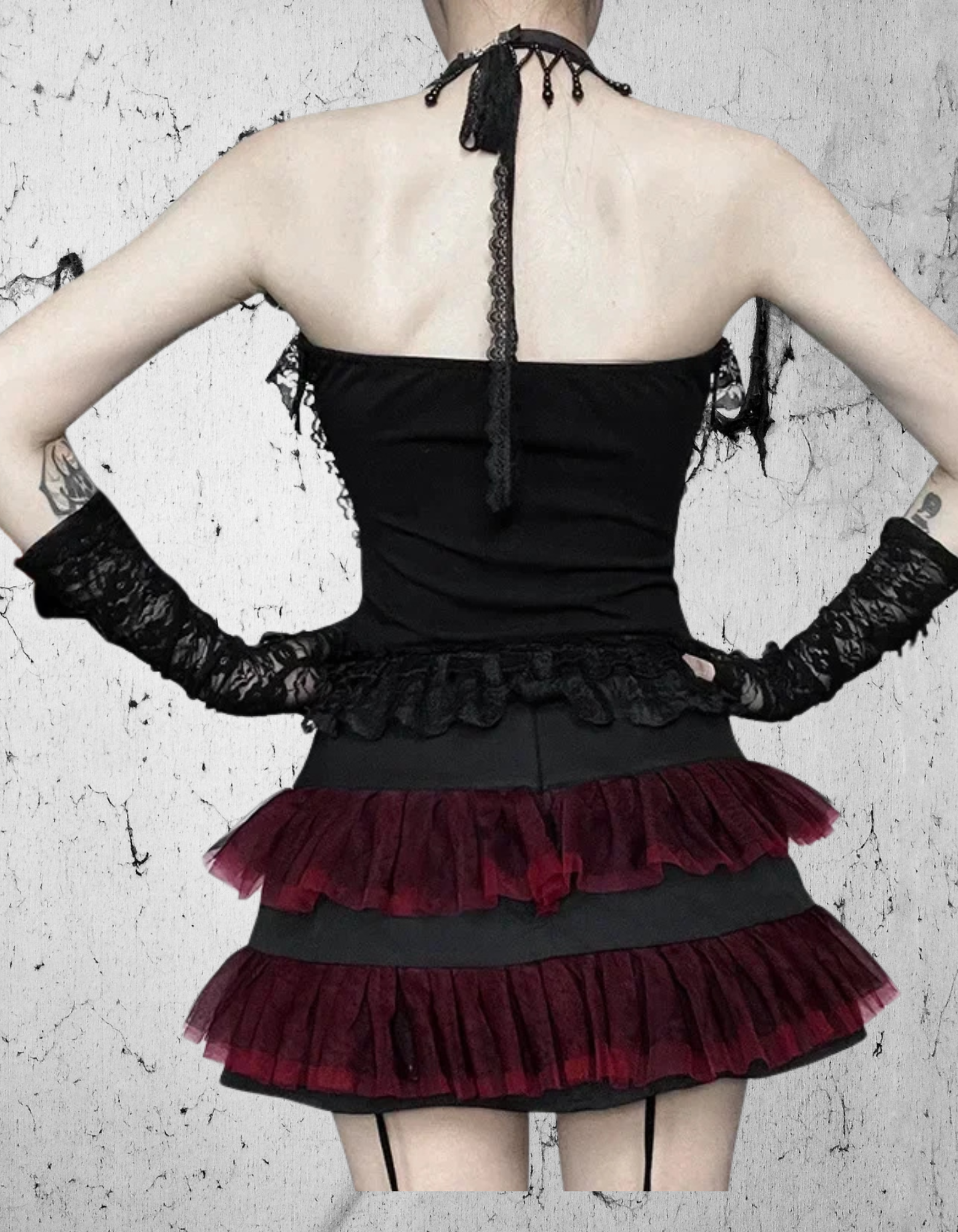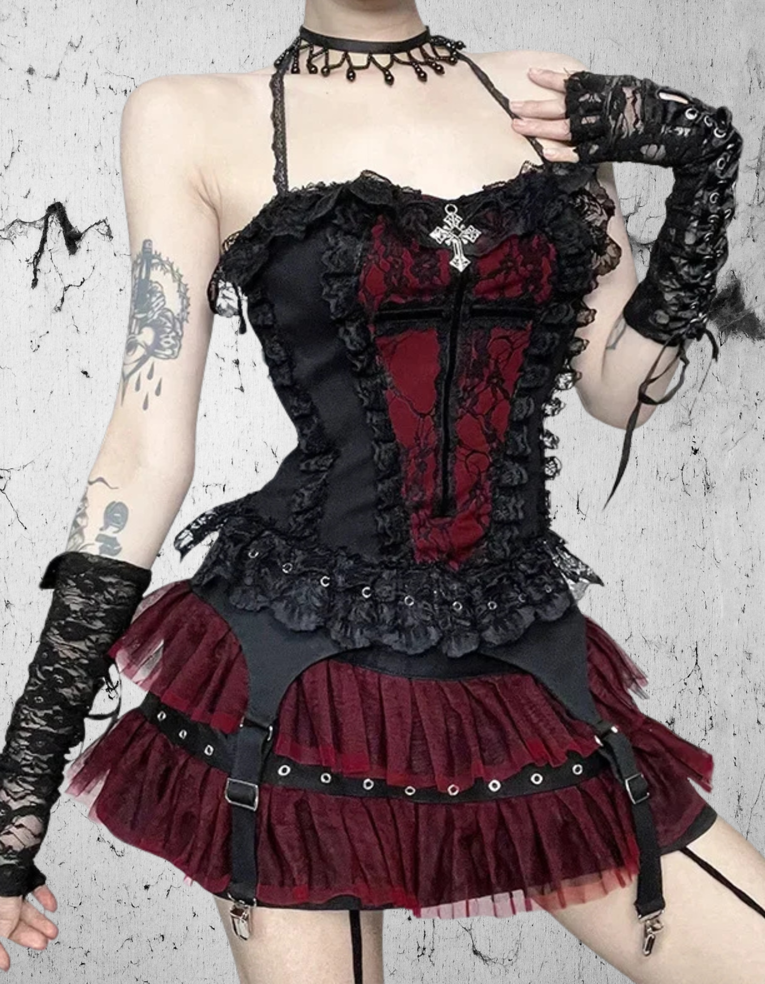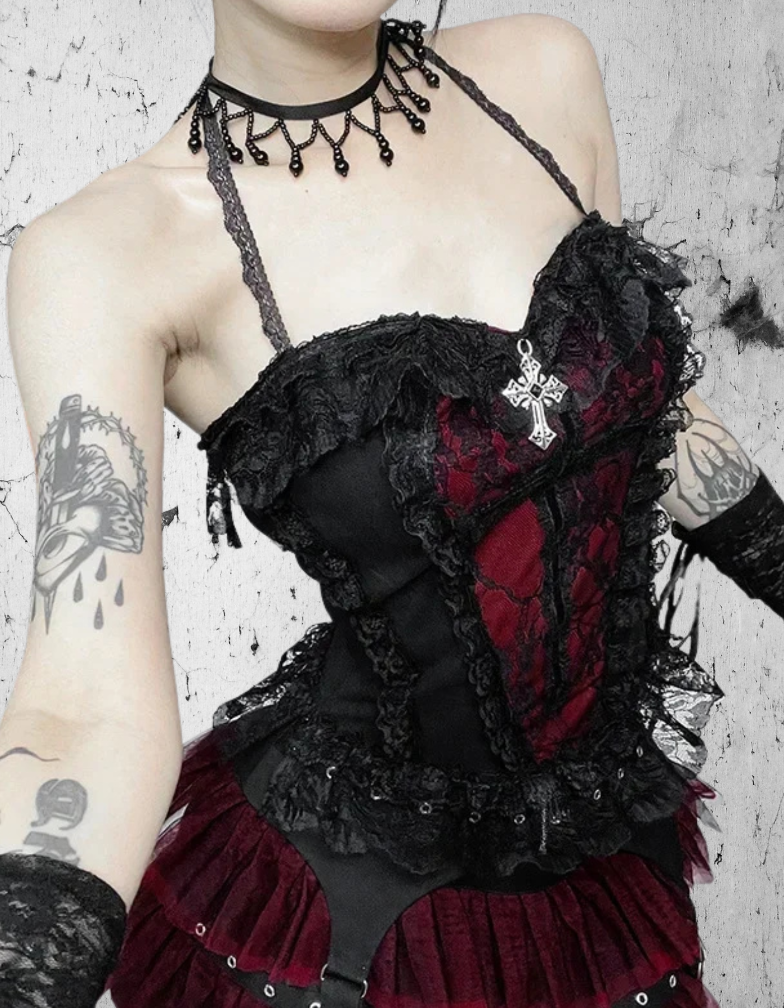 Czerwono-czarny kontrast podkreślony koronkowymi falbankami i detalami z gorsetowym sznytem nadaje topowi wyrazistego charakteru. Symboliczny krzyż gotycki z przodu stanowi mocny akcent – symbol tajemnicy, siły i estetyki gothic. Falbanki i koronki nadają całości romantycznego dramatyzmu, a dopasowany krój świetnie modeluje talię, eksponując kobiecą sylwetkę.
