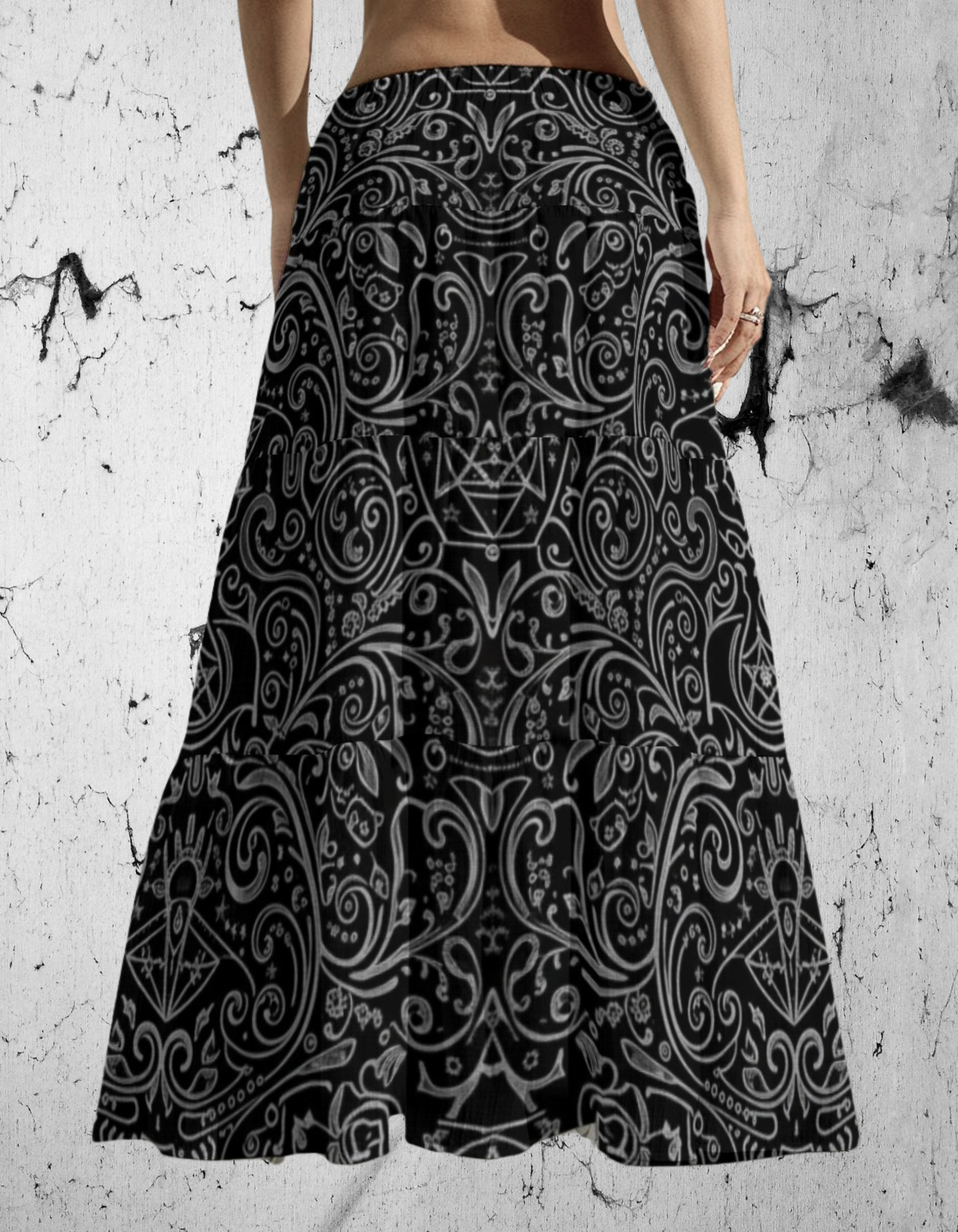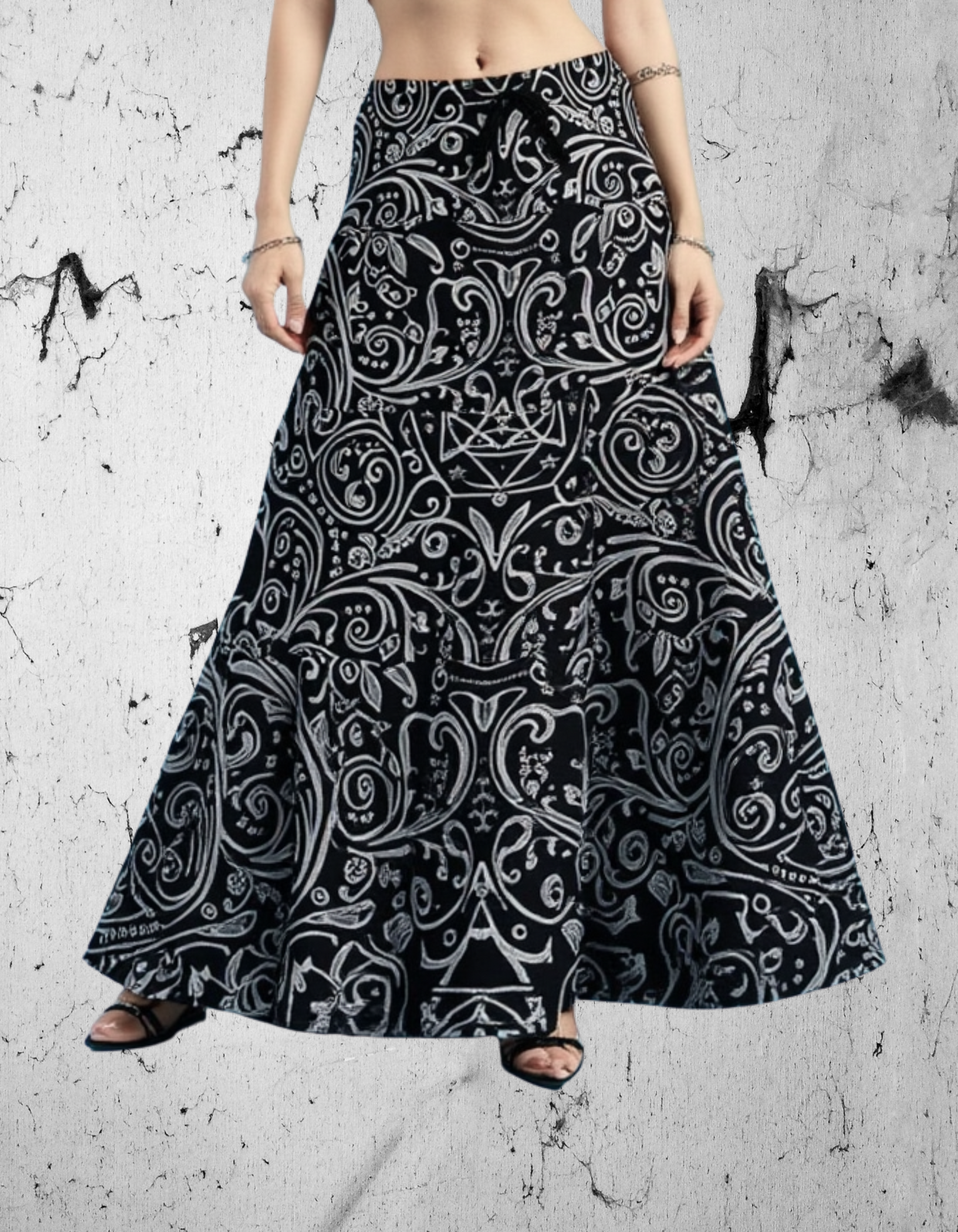 Każdy detal tej spódnicy przyciąga wzrok: ornamenty barokowe, ezoteryczne symbole ochronne, symetryczne wzory tworzące aurę tajemnicy i mocy. To ubranie, które doskonale współgra z mistycznym stylem dark boho, gotycką subtelnością i artystycznym wyrafinowaniem.
