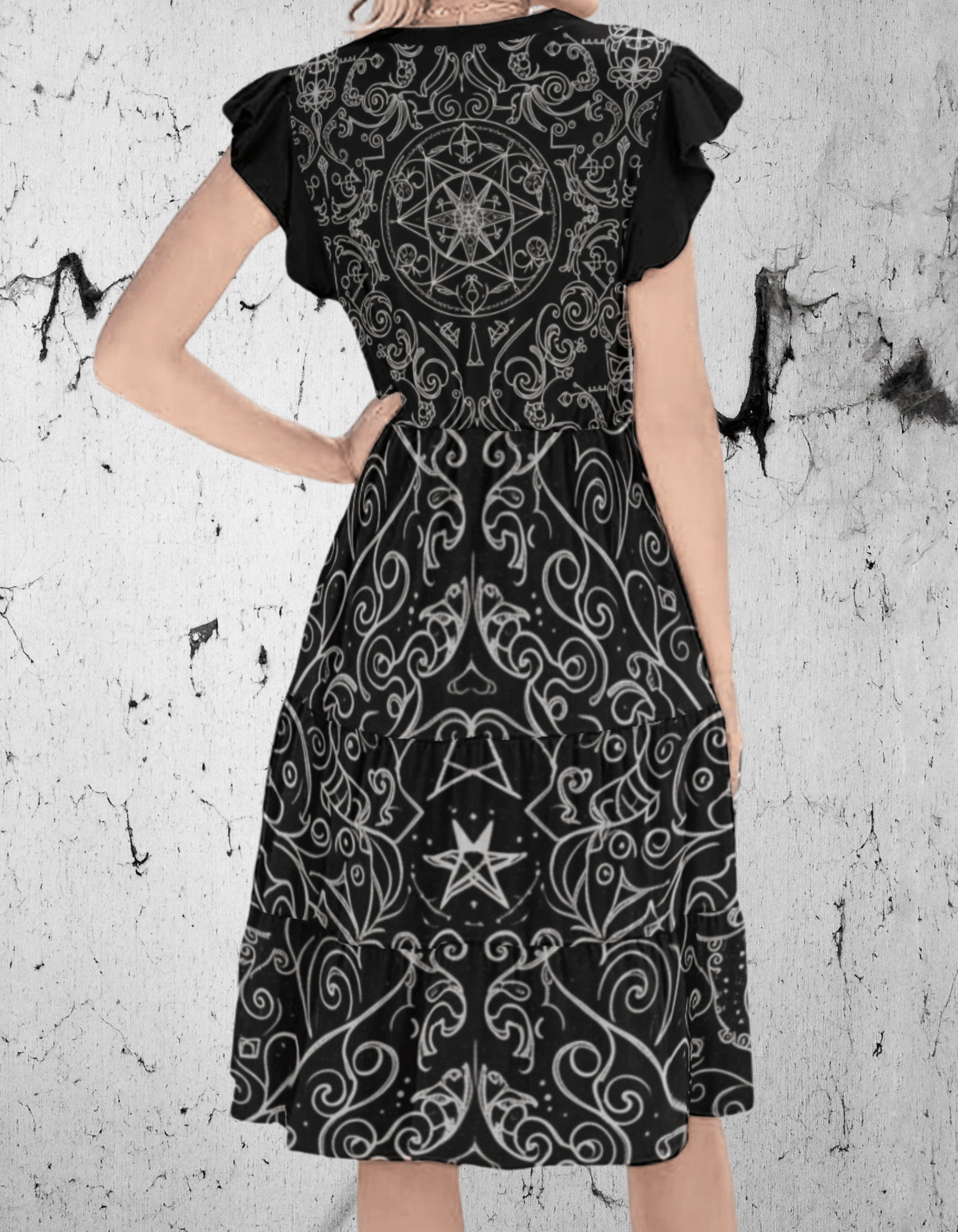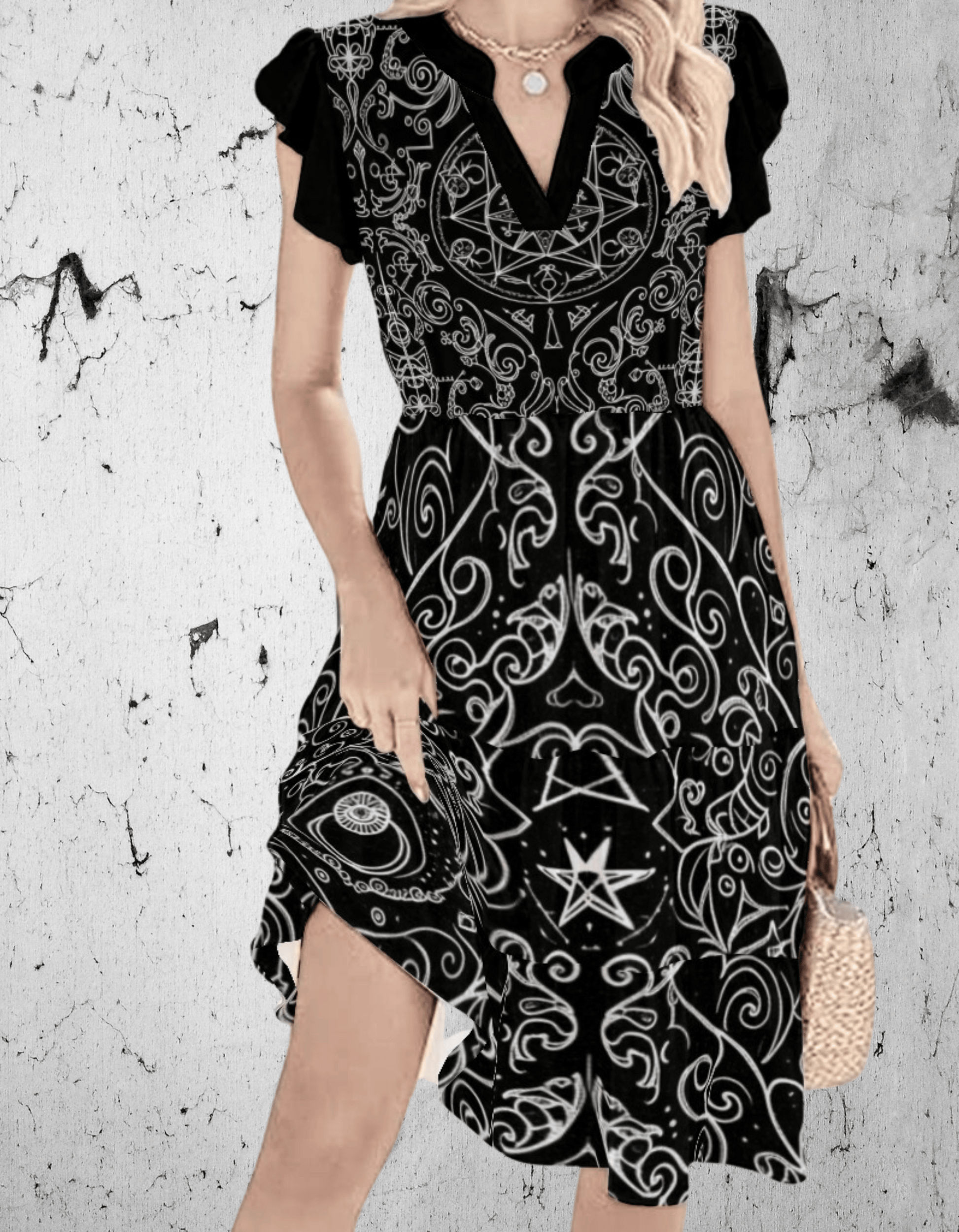 Ta niezwykła sukienka to połączenie gotyckiej elegancji, ezoterycznego mistycyzmu oraz artystycznego stylu vintage. Jej symetryczne ornamenty, pełne magicznych symboli, gwiazd, pentagramów i spirali, tworzą urzekającą kompozycję, która przyciąga wzrok i podkreśla wyjątkową osobowość. Każdy detal tej sukienki opowiada historię o duchowej głębi i wewnętrznej sile kobiety, która nie boi się iść własną drogą.