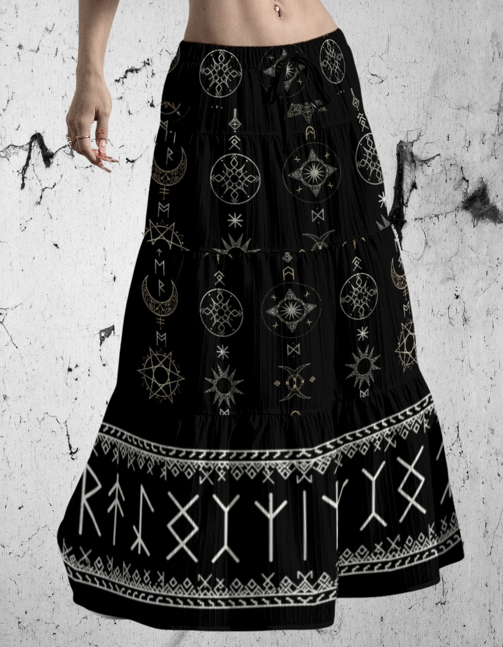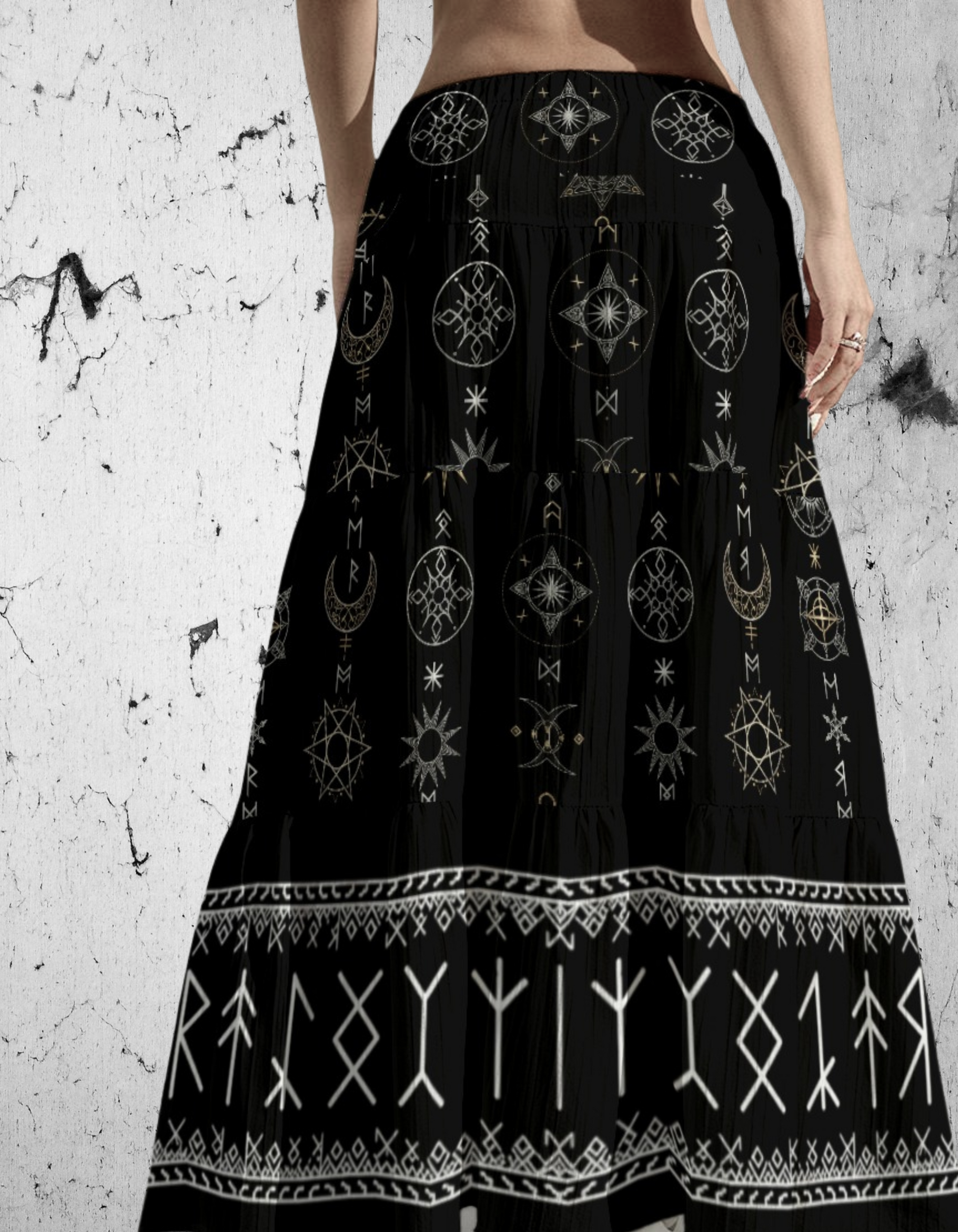 Wejdź w świat, gdzie moda gotycka spotyka się z mistyką słowiańskich tradycji. Spódnica Wichy Runs to coś więcej niż tylko element garderoby – to manifestacja mocy, niezależności i duchowości. Każdy detal wzoru – od run po symbole księżycowe i okultystyczne kręgi – tworzy magnetyczną aurę, która od razu przyciąga spojrzenia. Plisowana, rozkloszowana forma nadaje sylwetce lekkości i dynamiki, a czarna baza materiału wydobywa kontrast runicznych zdobień w tonacji bieli i złota.