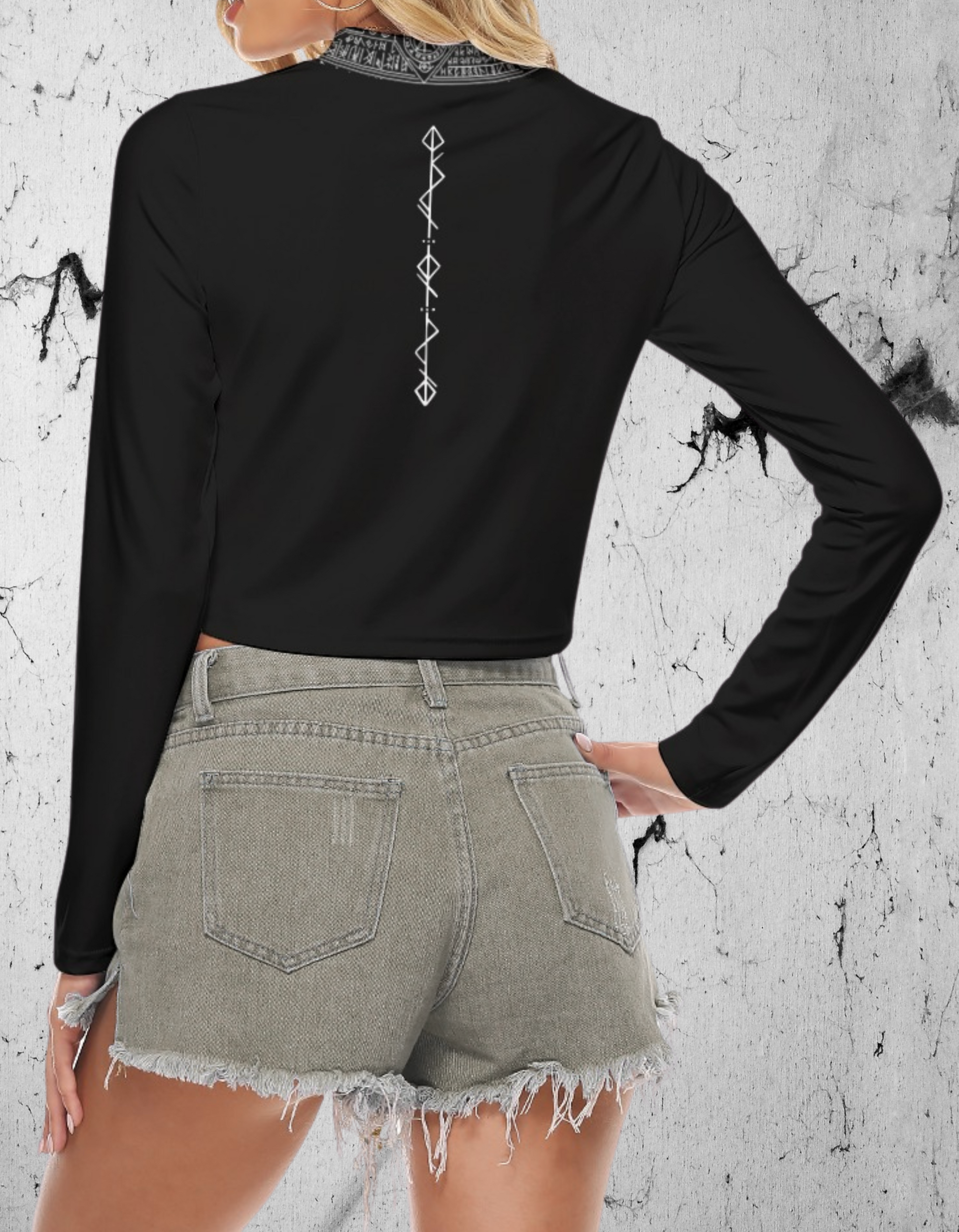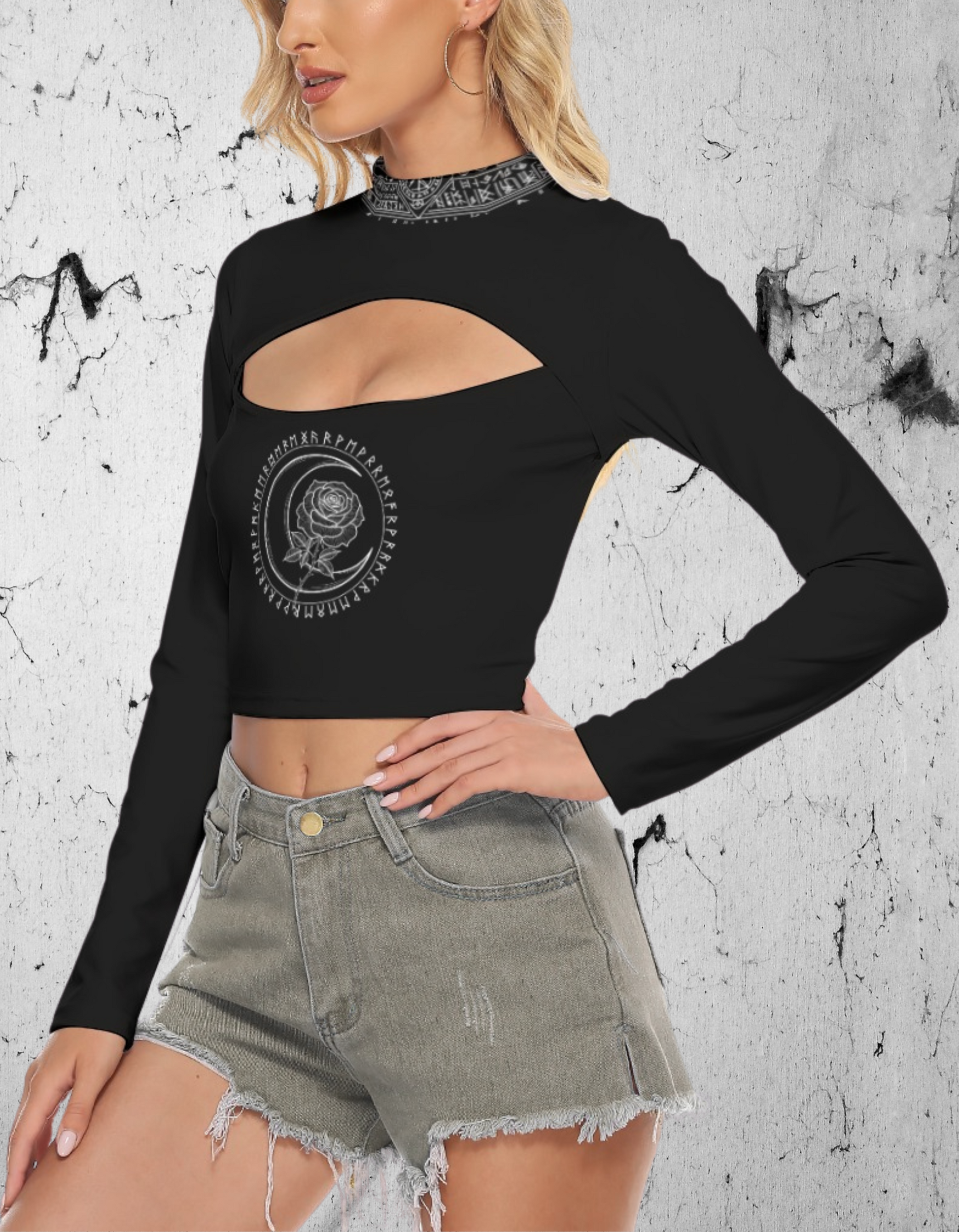 Charakterystyczny golf ozdobiony runicznym wzorem, geometryczne wycięcie na dekolcie oraz centralny nadruk róży otoczonej magicznym kręgiem czynią ten top czymś więcej niż ubraniem – to manifestacja stylu i wewnętrznej mocy.