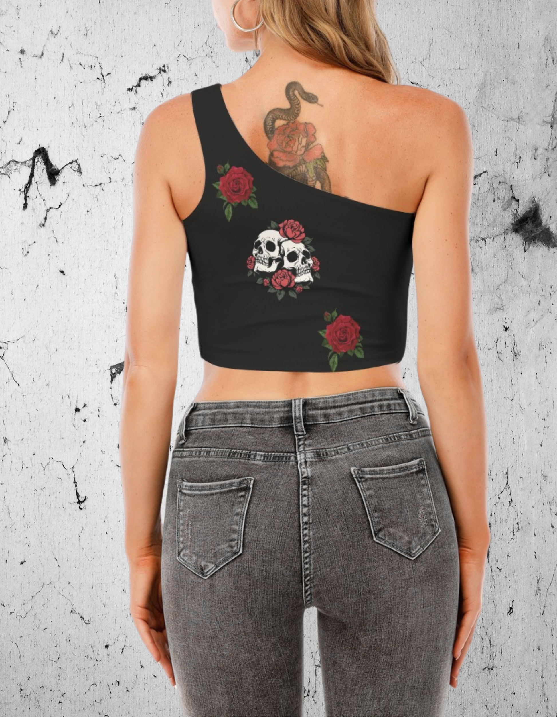 Odkryj unikatowy gotycki top asymetryczny wykonany z wysokiej jakości materiału (80% poliester, 20% spandex, gramatura 230 g/m²), który łączy wygodę z wyrazistym, mrocznym designem. Przód zdobi efektowny biały krzyż w stylu tribal, a tył – kompozycja dwóch czaszek otoczonych czerwonymi różami, dodatkowo uzupełniona pojedynczymi kwiatami po bokach. Czerń tkaniny w połączeniu z kontrastującymi detalami tworzy niezwykle wyrazisty efekt wizualny, idealny dla miłośników estetyki gothic, alternative i rock.