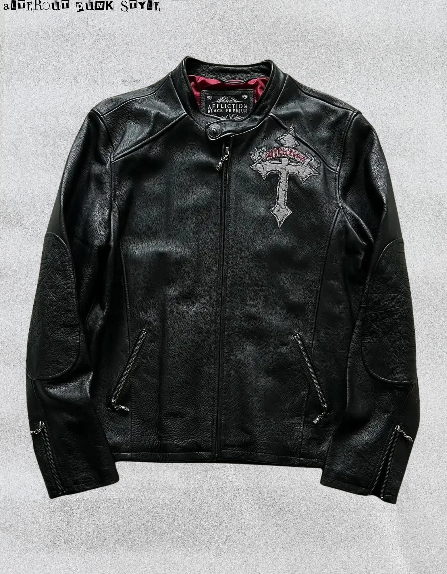 Kurtka Skull&Cross Rebel to kwintesencja buntowniczego stylu – mocny przekaz, wyrazista symbolika i perfekcyjne wykonanie. Wykonana z wysokiej jakości sztucznej skóry w połączeniu z poliestrem, stanowi połączenie trwałości i wygody. Jej najważniejszym elementem jest duży, haftowany motyw czaszki ze skrzydłami na tle krzyża, uzupełniony gotyckim napisem Affliction oraz hasłem Live Fast.