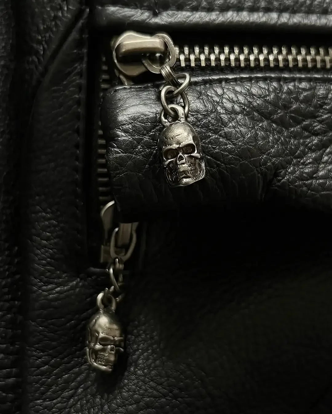 Przód kurtki zdobi mniejsza wersja tego motywu, dyskretnie dodająca charakteru. Metalowe zamki, ozdobne przeszycia i wzmocnione łokcie nadają jej surowy, rockowo–motocyklowy klimat. Całość została zaprojektowana tak, by przyciągała wzrok i podkreślała indywidualność właściciela.