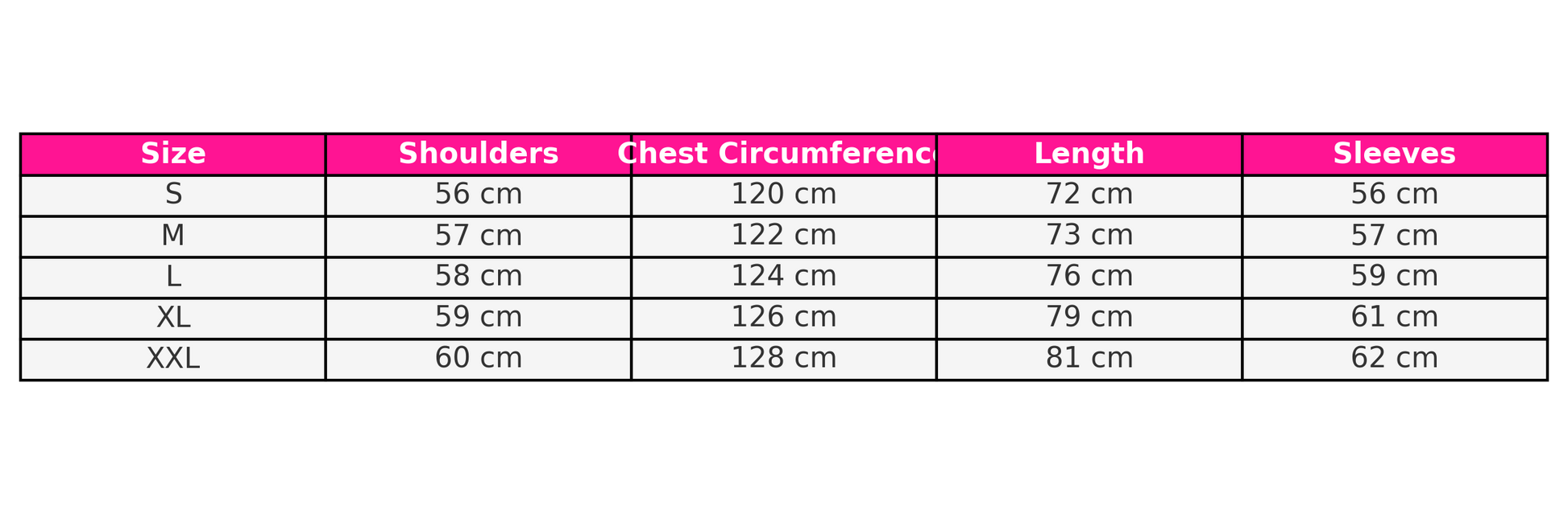 Rozmiar | Ramiona | Obwód klatki | Długość | Rękaw |