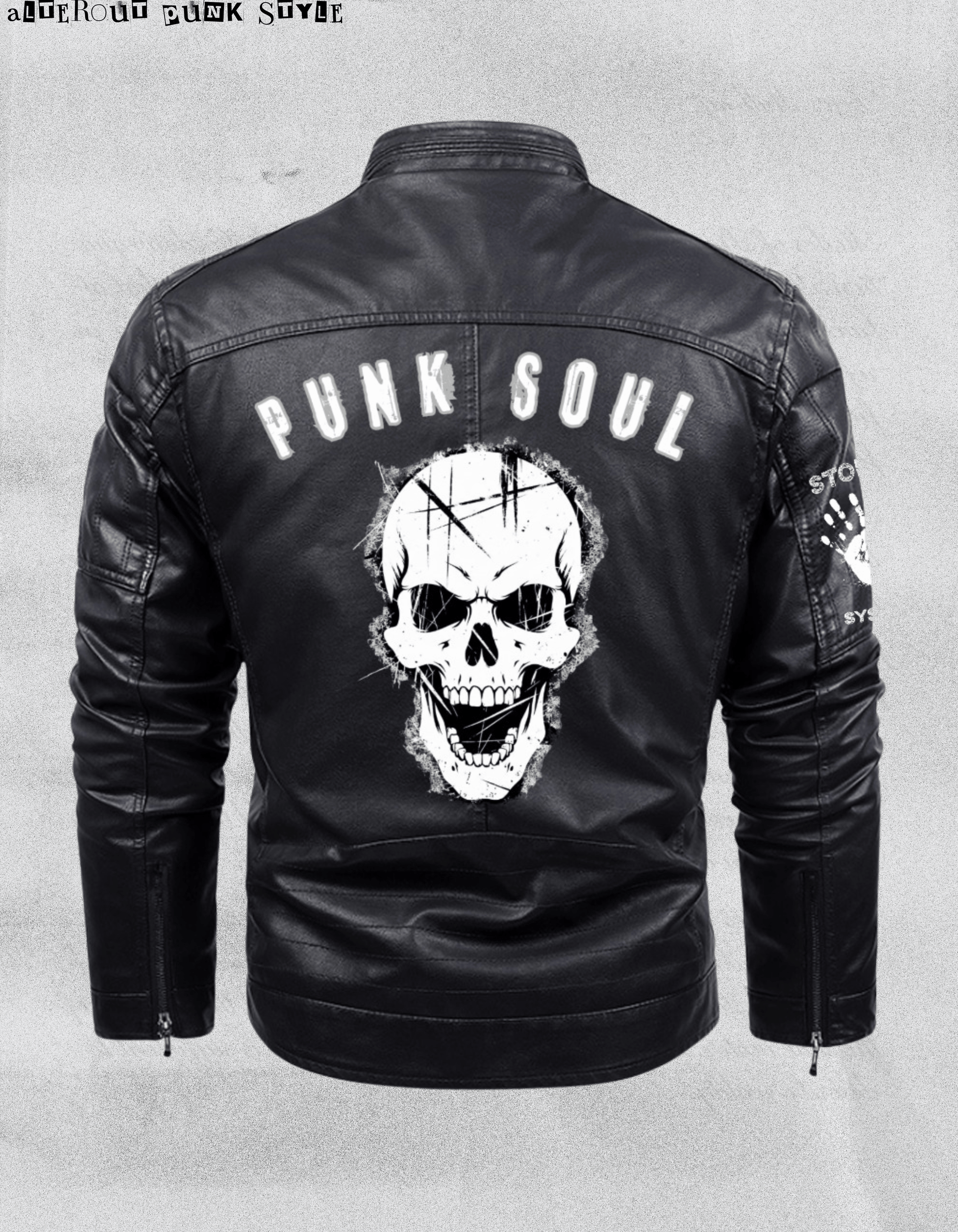 To, co od razu przykuwa uwagę, to graficzny nadruk czaszki na plecach oraz wyrazisty napis PUNK SOUL. Każdy detal jest przemyślany – od anarchistycznego symbolu na piersi, po hasła buntownicze na rękawach (Stop System), które podkreślają antysystemowy charakter kurtki.