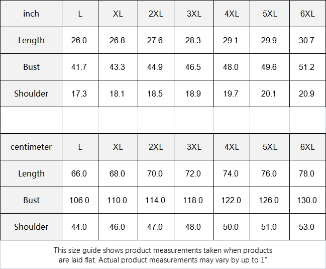 inch | L | XL | 2XL | 3XL | 4XL | 5XL | 6XL |