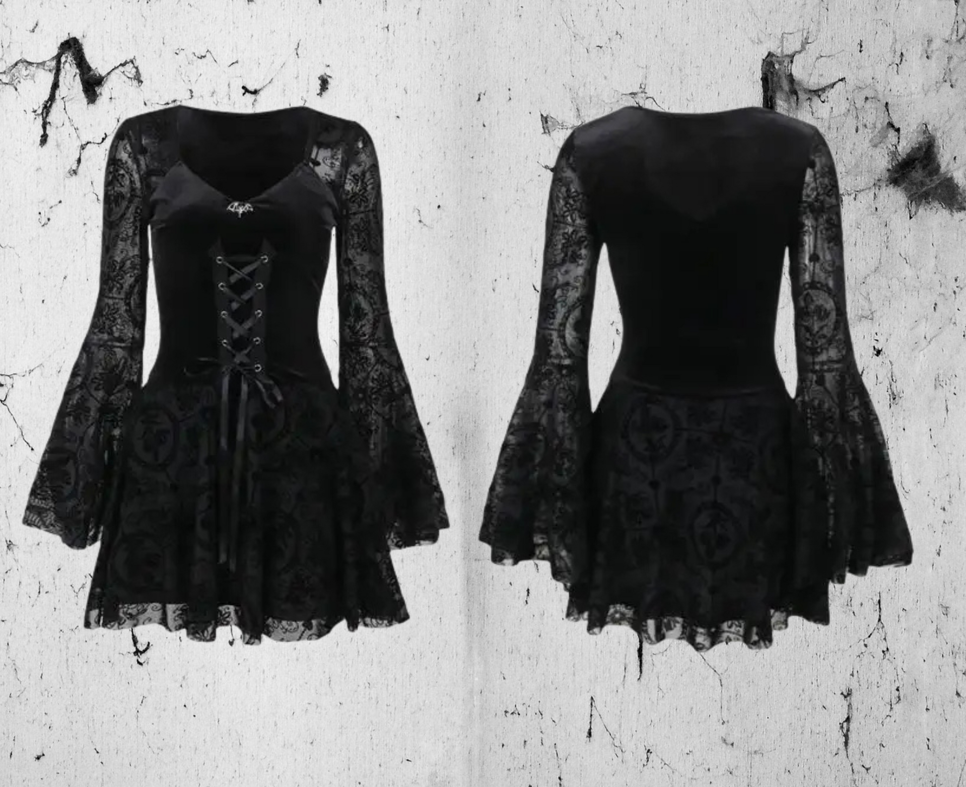 To, co wyróżnia tę sukienkę gothic, to jej misterne koronkowe rękawy. Długie, rozszerzane rękawy (tzw. "dzwony" lub "trąbki") z delikatnej, transparentnej koronki z motywem roślinnym lub paisley nadają sukience eteryczny i dramatyczny wygląd. Koronkowy wzór jest również widoczny na dolnej części sukienki, tworząc harmonijną całość i dodając głębi teksturze. Całość tworzy niepowtarzalny wygląd, idealny na koncerty gotyckie, festiwale, imprezy tematyczne czy po prostu na wieczorne wyjścia, gdzie chcesz wyróżnić się z tłumu w alternatywnym stylu.